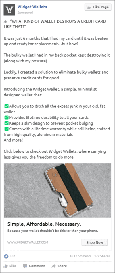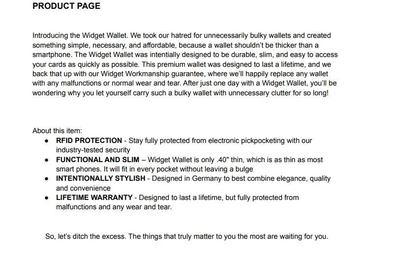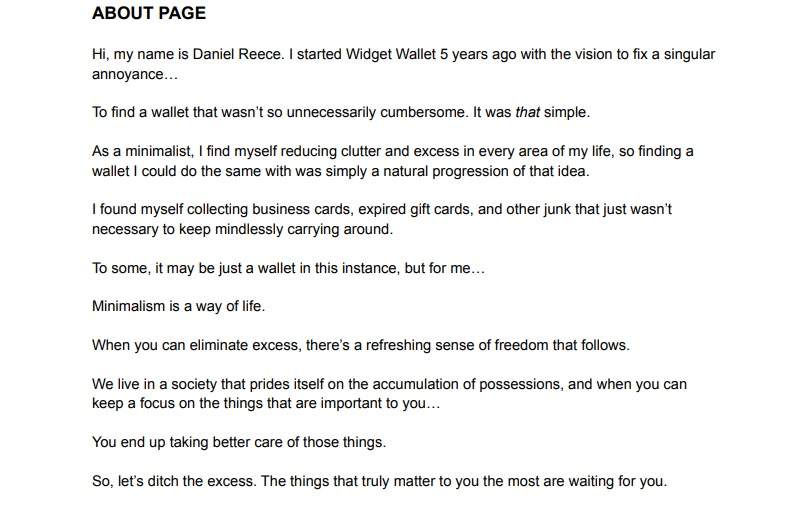 As requested, I spent a few minutes skimming my room and decided on my wallet. As I am the target audience for that particular product, I laid out a few pain points to include in the copy (e.g. previous wallet was bulky, made sitting uneven, kept ruining my cards, etc.) and used the About page as a more emotionally driven, bigger picture approach to why less is more not only in a wallet but in most other areas of your life.