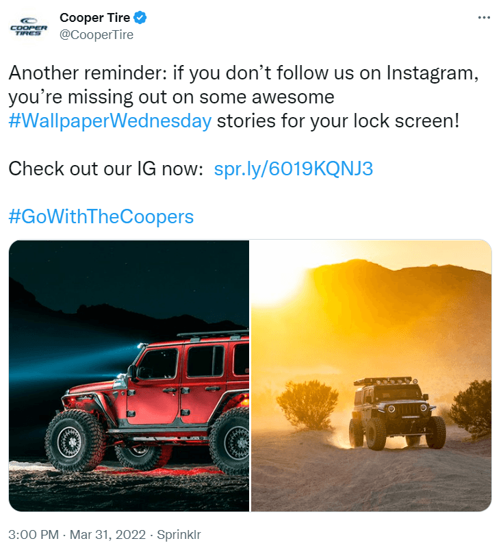 In an effort to utilize other features of Cooper Tire social channels to modernize the content of our pages, we launched a series of Instagram Story posts. We created highlighted stories on the Cooper Tire page to enhance its look and feel. Below are some examples of our Instagram stories, most namely our #WallpaperWednesday series and IG Story quizzes/polls.