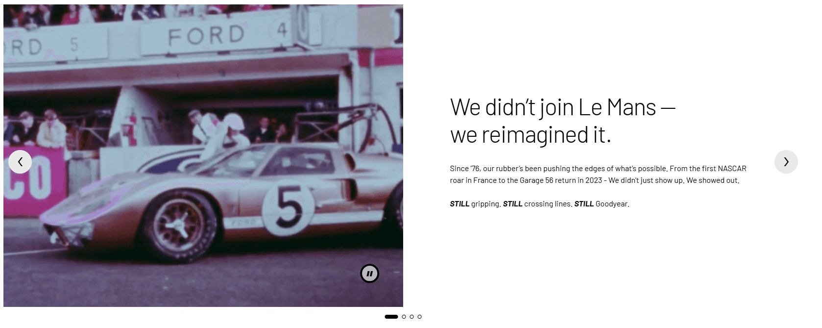 We pulled the brand into the 21st century with its Still. Always. Forever. campaign, showcasing Goodyear's innovation and cultural significance, from the blimp to movies to record-breaking races. After all, Goodyear makes tires worth bragging about.