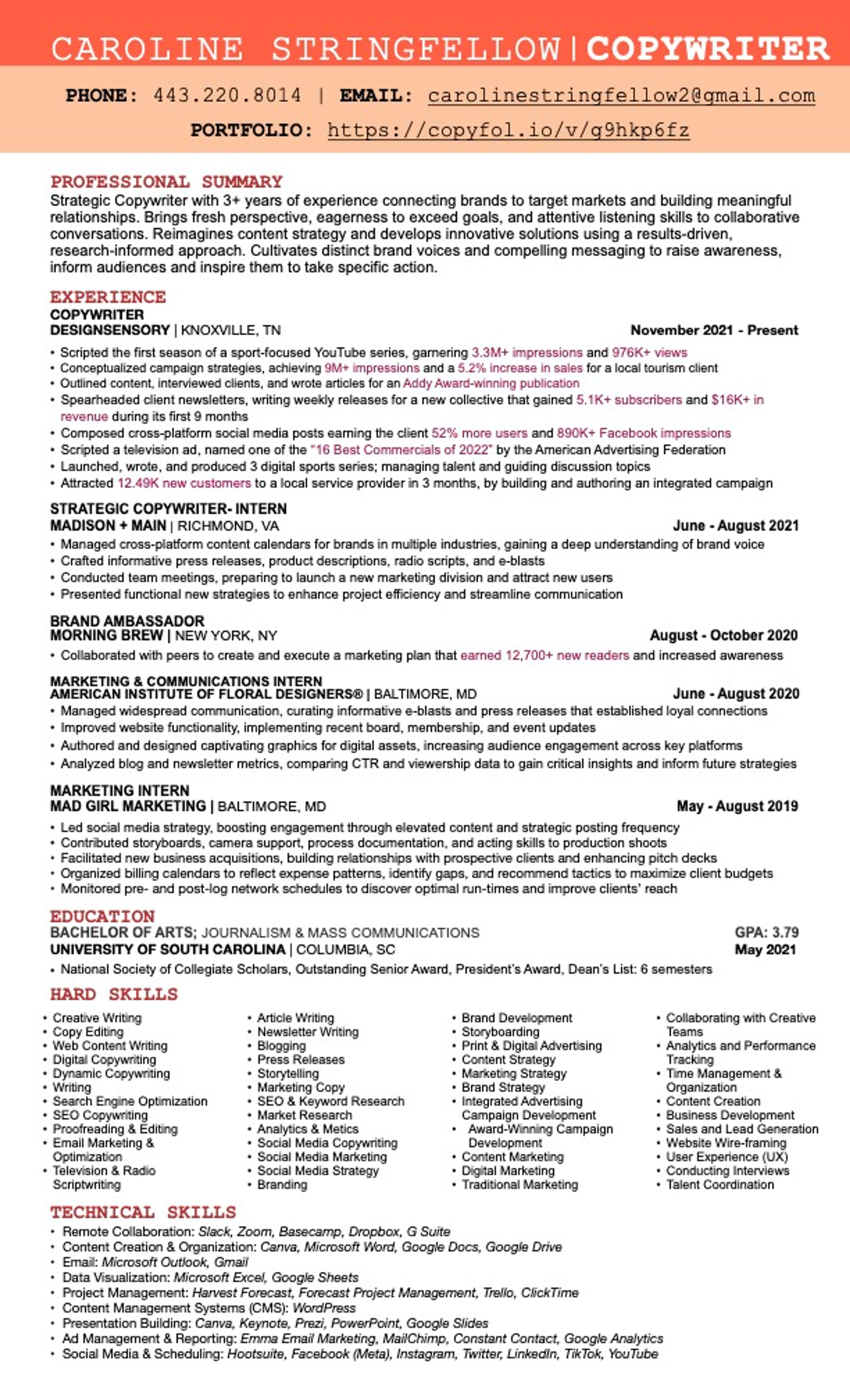 Designsensory | November 2022-present (Copywriter); November 2021 - November 2022 (Jr. Copywriter) |
