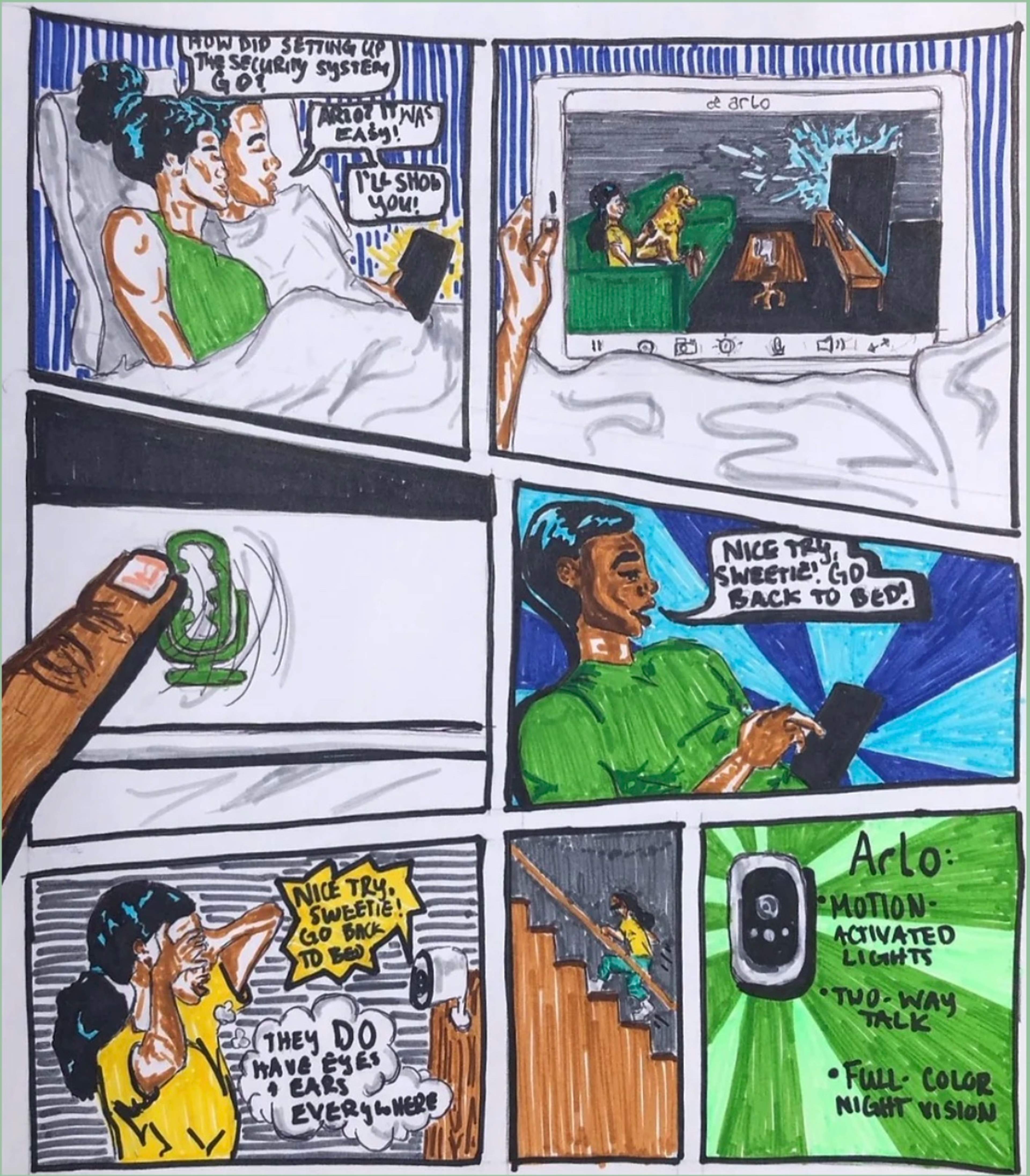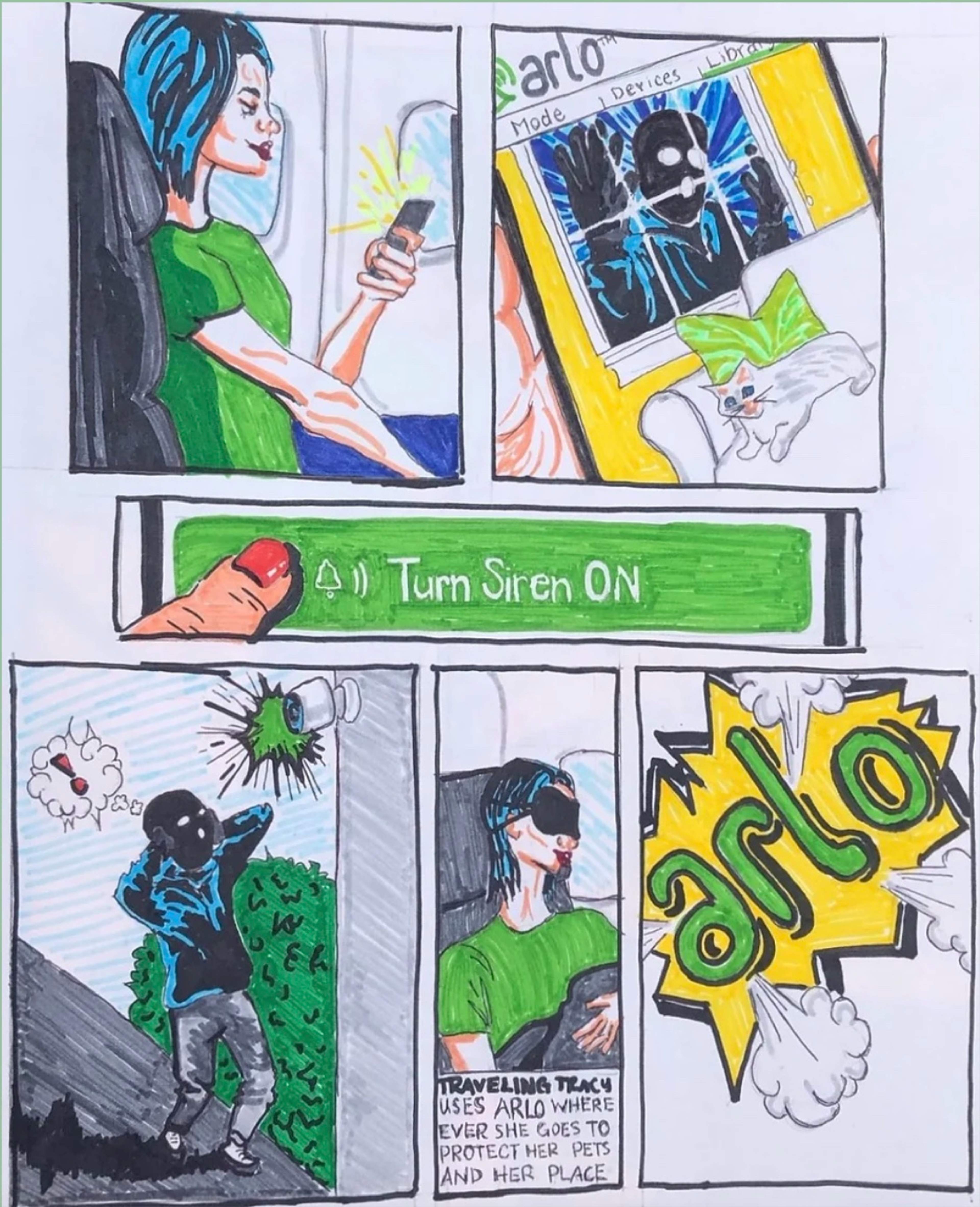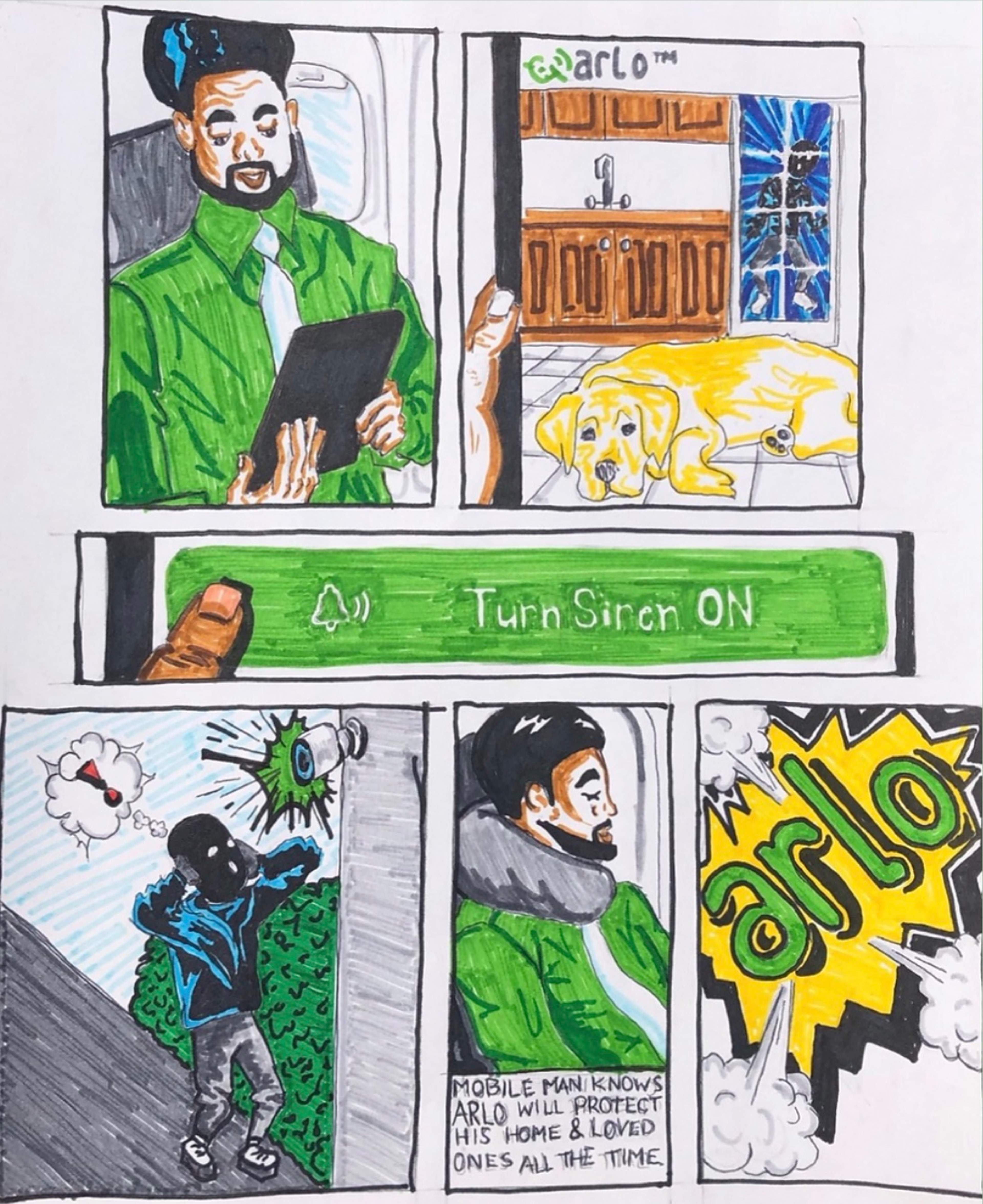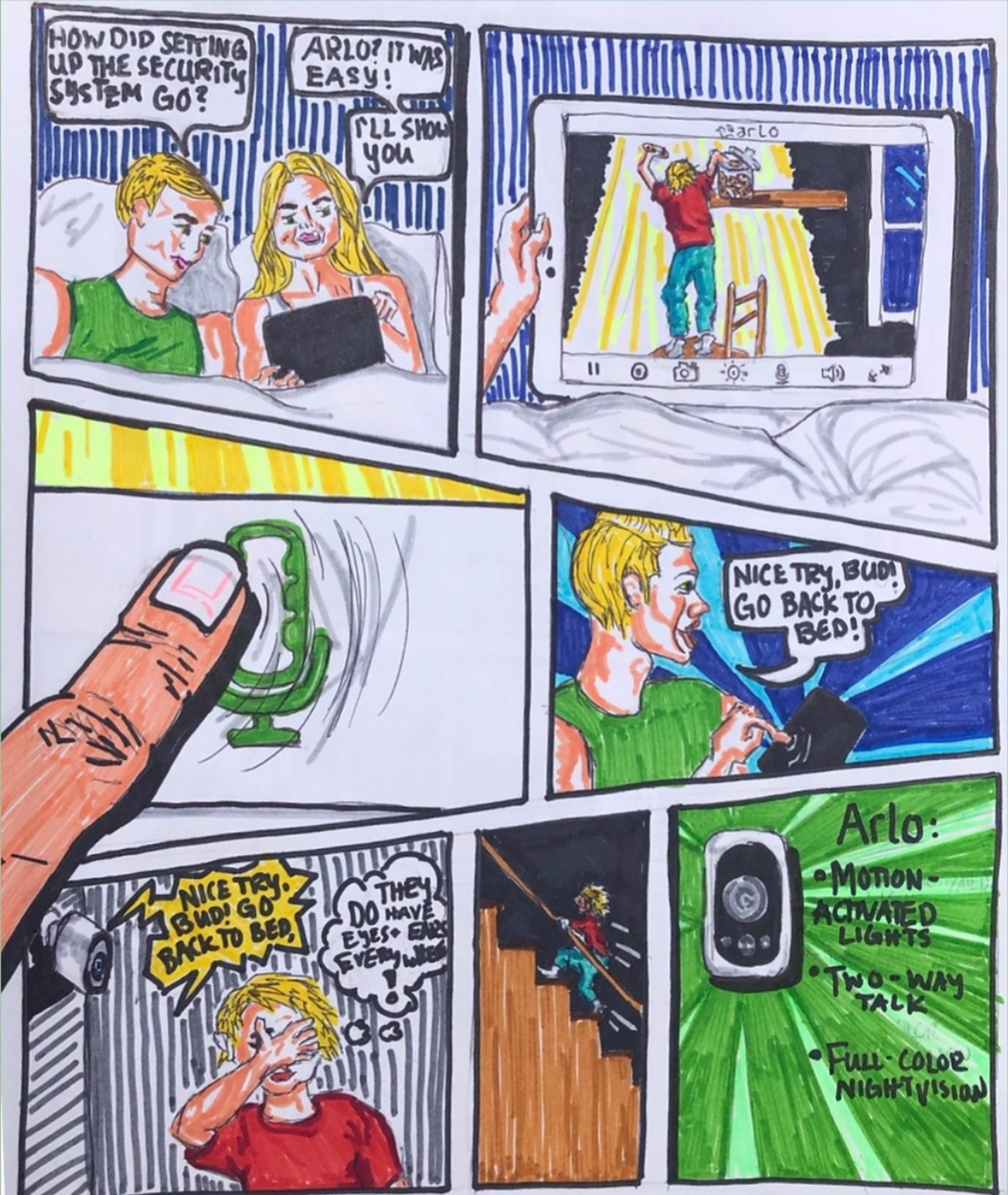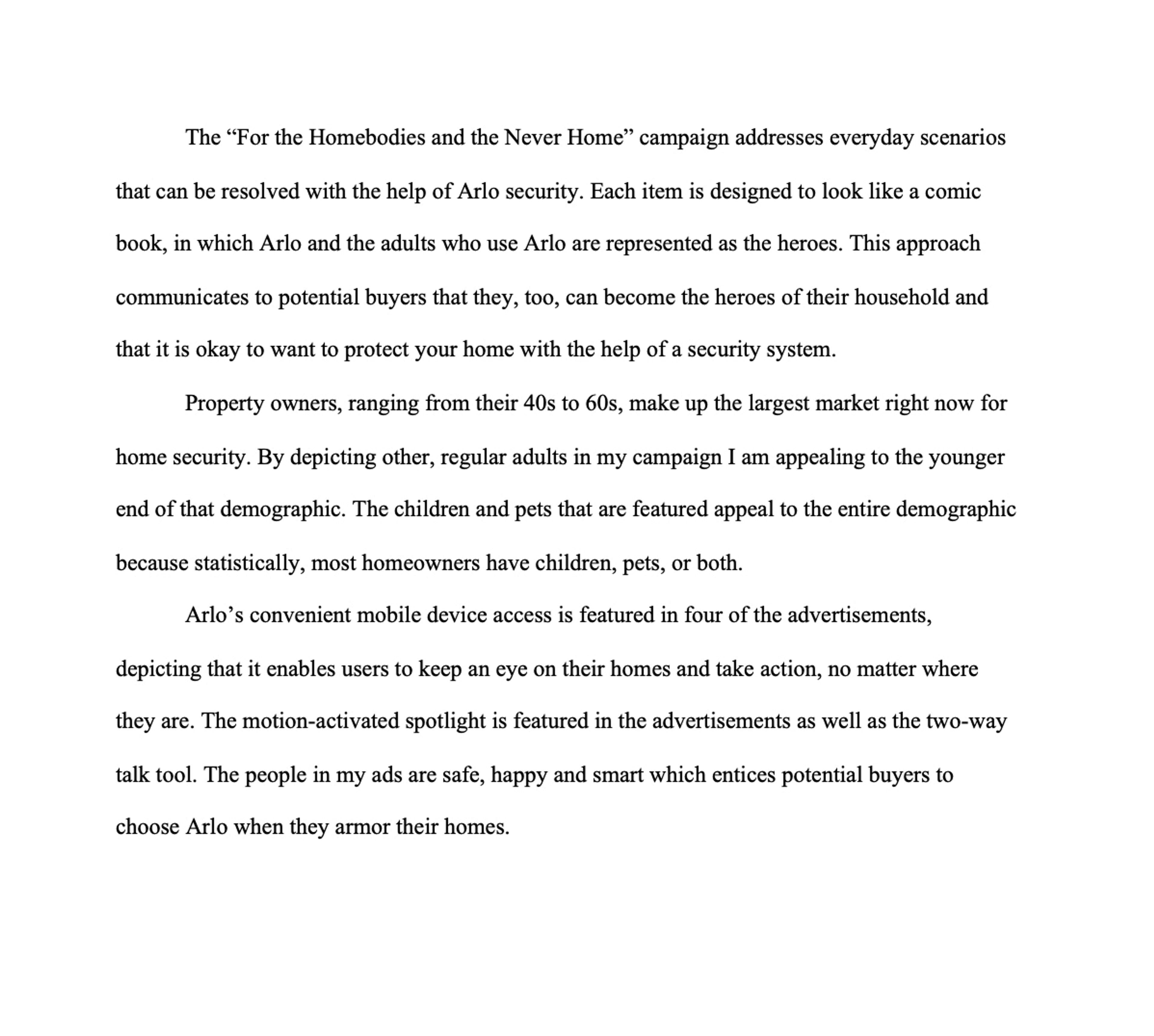 Two nights before my project was due, the USC computer lab updated all of the desktops which I had used to work in Adobe Creative Suite to complete the graphic design portion. All of my work was erased so I decided to pivot. I hand-drew a series of comic book-style print ads, positioning the product as a superhero stopping crime and protecting it’s owners from danger.