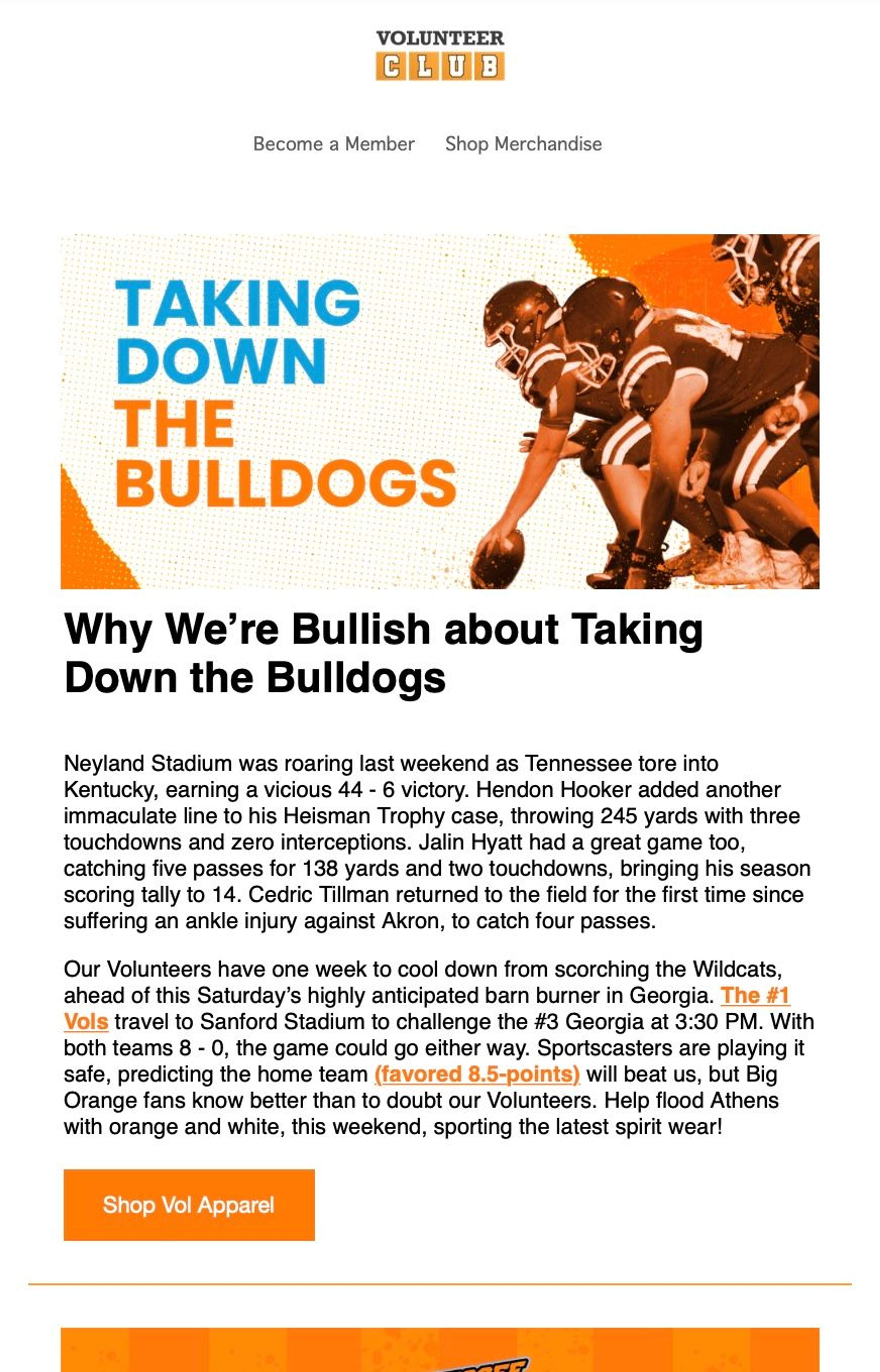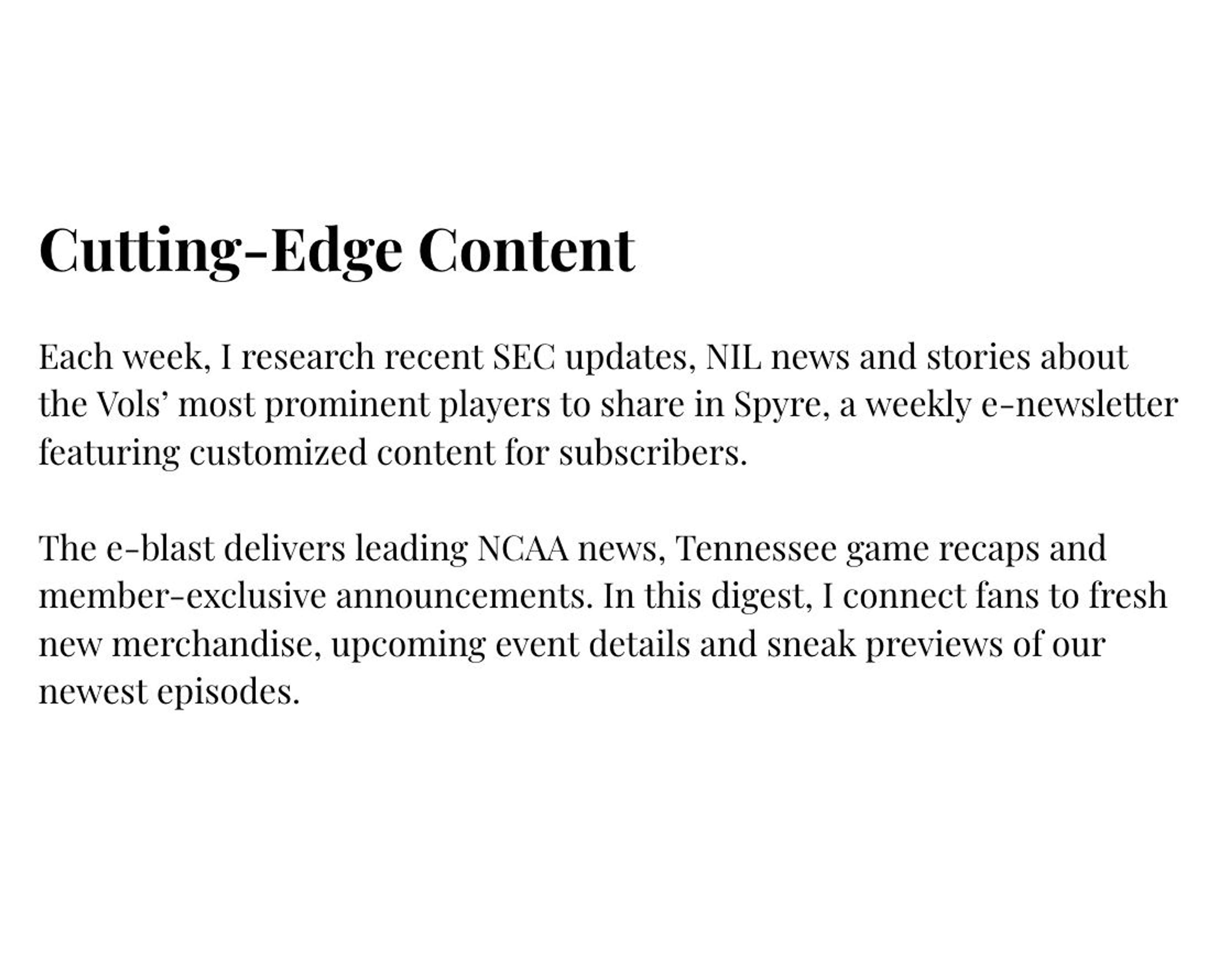 The Vol Club needed original content featuring top Tennessee players to serve as publicity for the student-athletes and share with members. They enlisted my help writing weekly newsletters, episodic interviews and additional branded content.