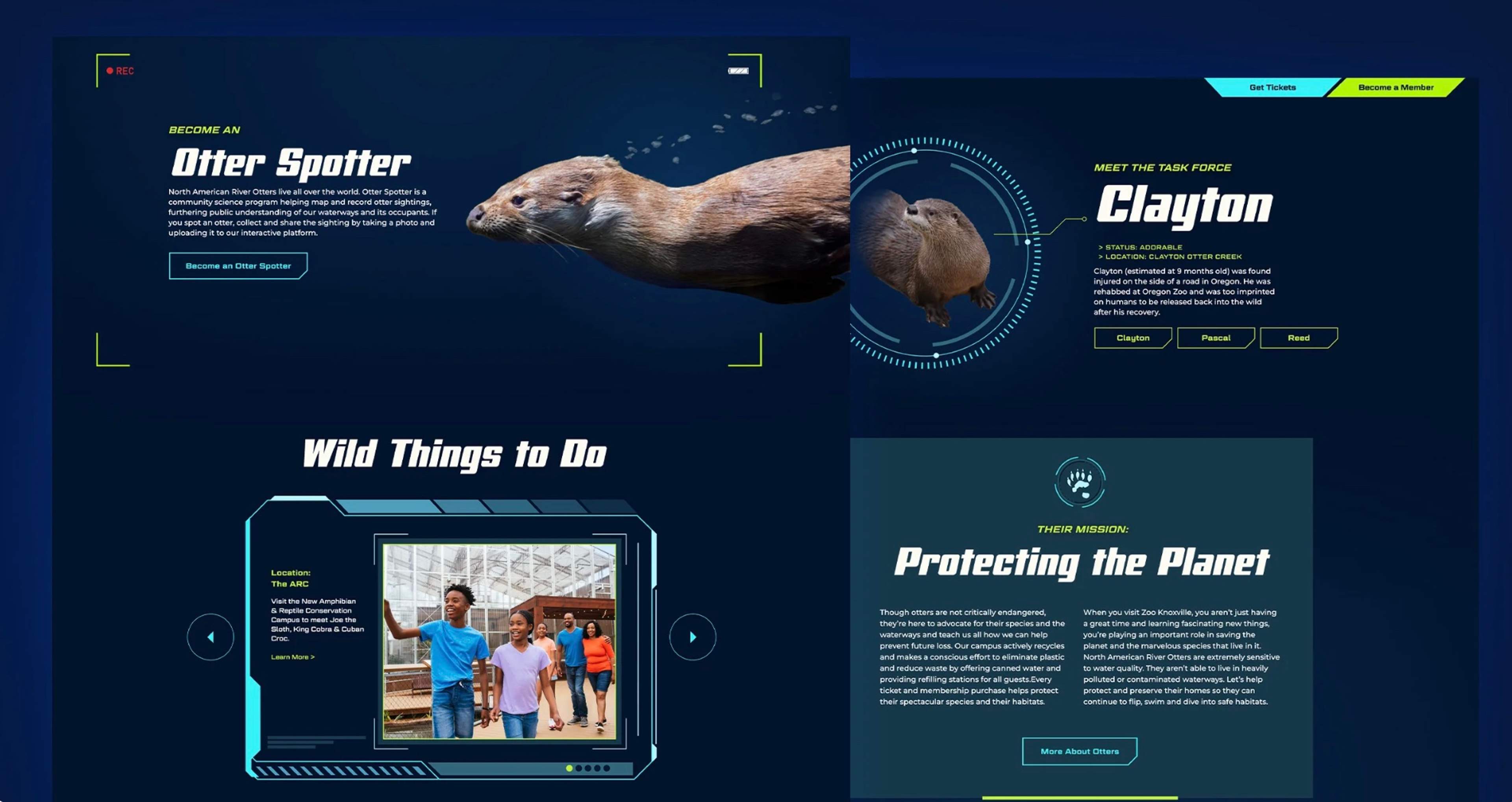 Compositing clear messaging and informative content, we introduced the audience to the featured residents, emphasizing their excitement to join the zoo family. Between detailed information educating visitors on the environmental initivative the otters’ were advocating and helpful resources to drive traffic, we incorporated new photography and videos showcasing the “agents” acclimating to their new home and links for users to purchase tickets and memberships.