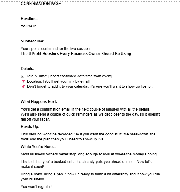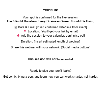 The aim for this copy was to thank people for signing up to a free webinar, aimed at small business owners who are looking to boost their profits.