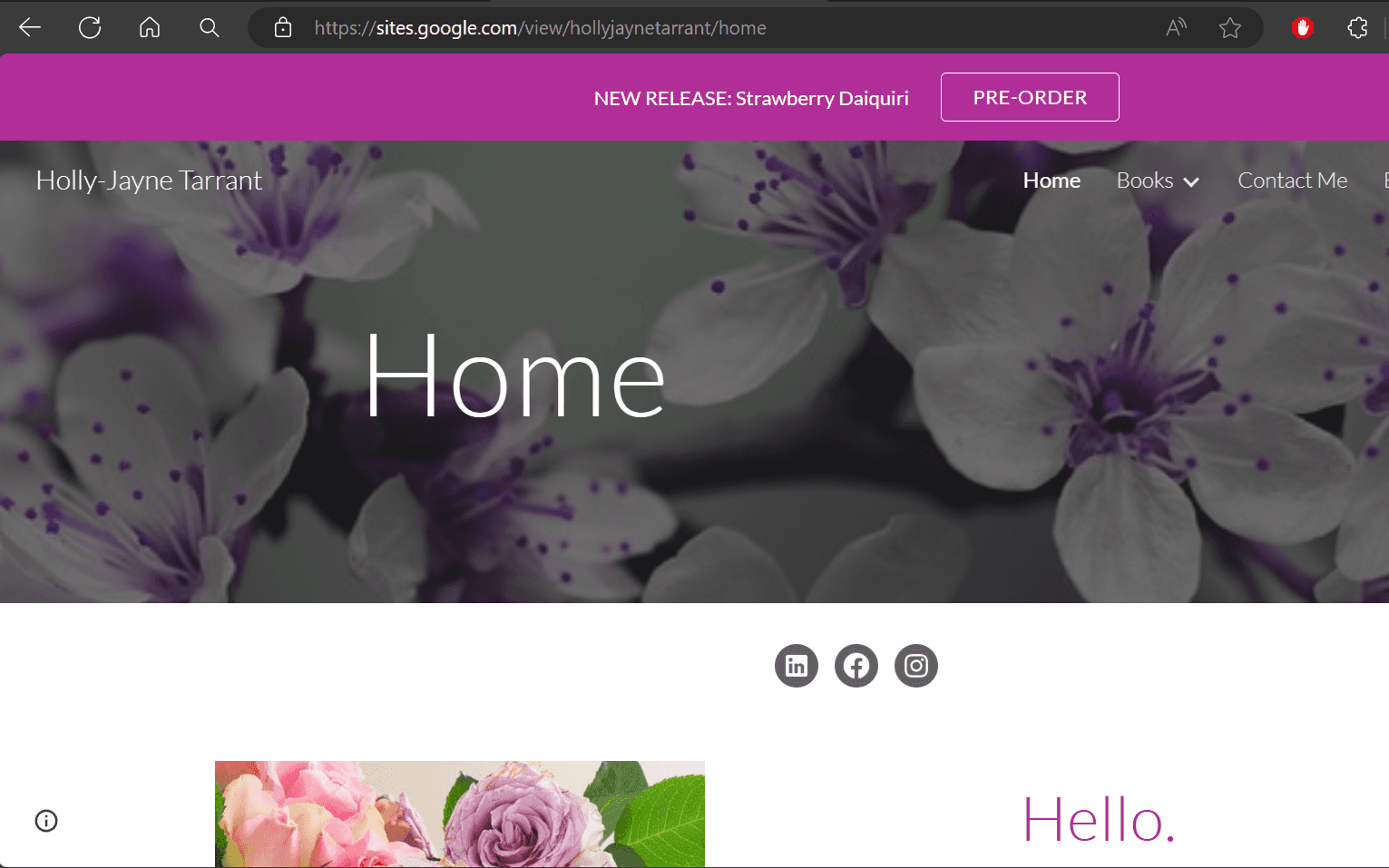 To provide the viewer with the most important information (the newest book release) I put a banner on the top of the site which reads 'NEW RELEASE: Strawberry Daiquiri' with a button allowing the visitor to pre-order the newest release. The idea of this banner is that it will be easily edited by the author whenever there's a new book coming out. The banner stays across the top of the site, no matter what page they are browsing.