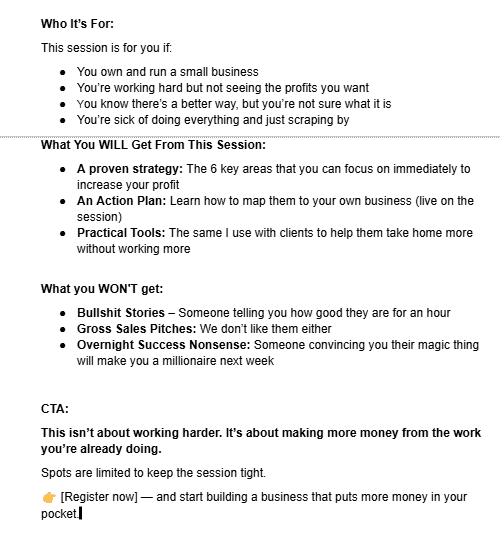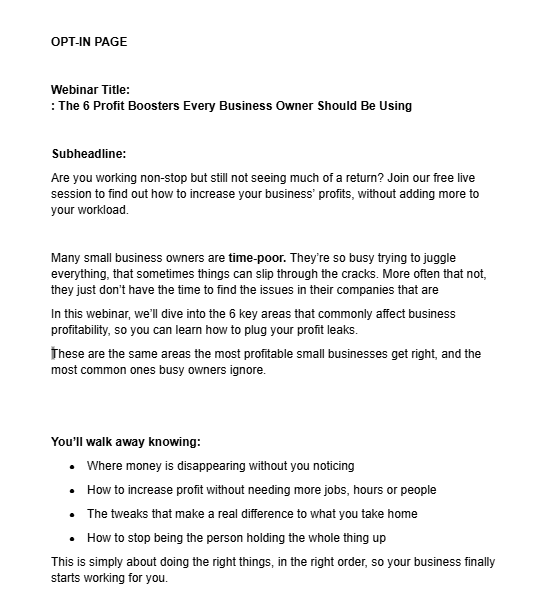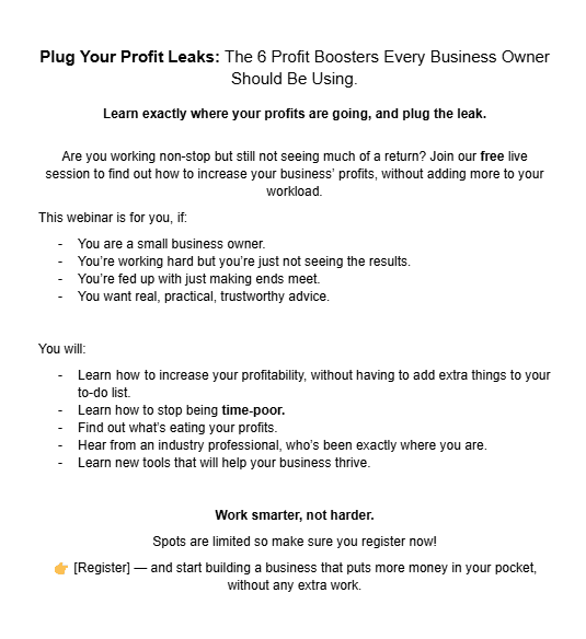 The aim for this copy was to get people interested in signing up for a free webinar, aimed at small business owners who are looking to boost their profits.