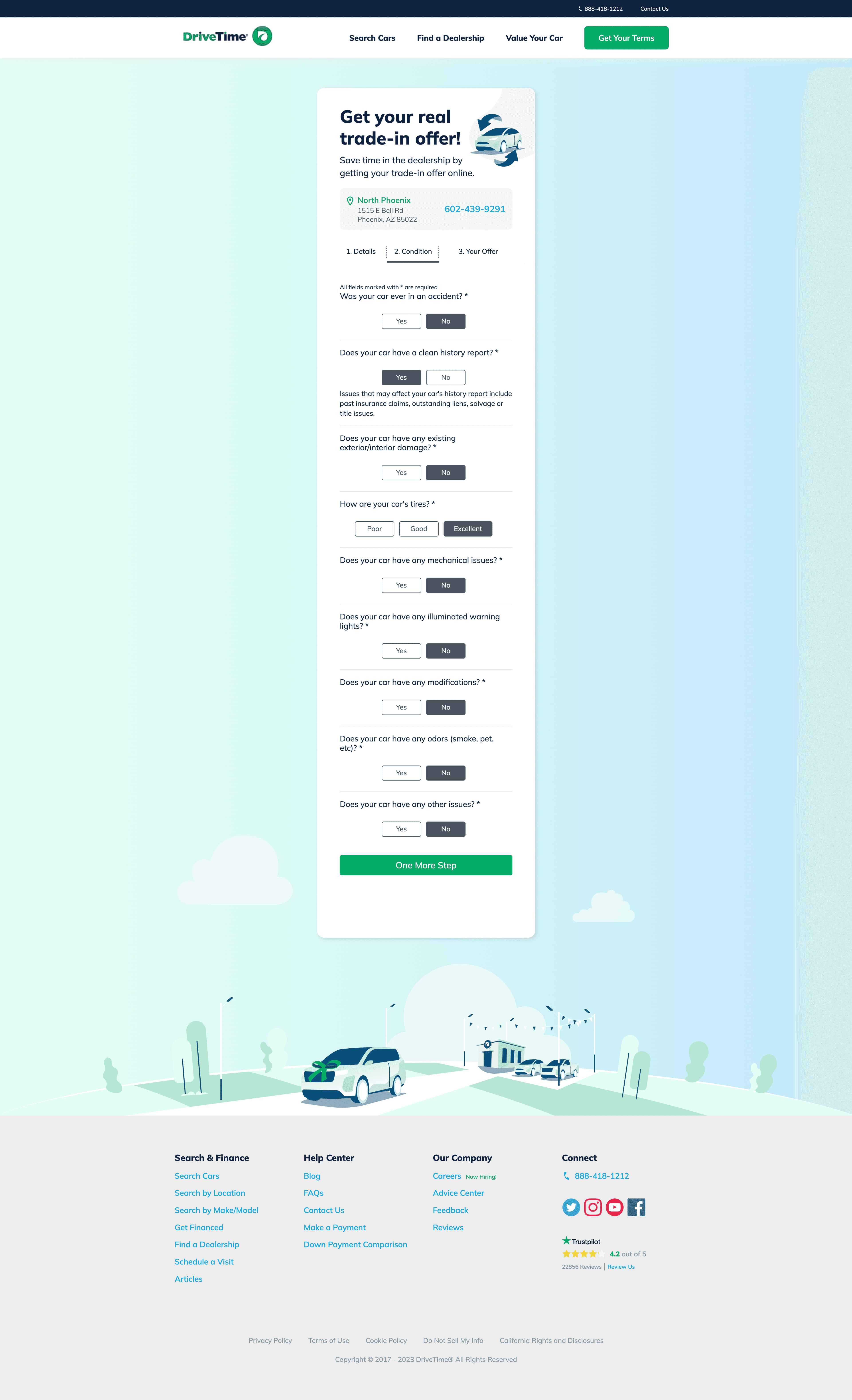 We created an entirely new trade-in experience on DriveTime.com. DriveTime partnered with an industry-leading third party to create a custom i-frame located within the DriveTime site. The biggest goal of this project was to craft a seamless trade-in experience online to keep users on our site shopping after they receive their offer.