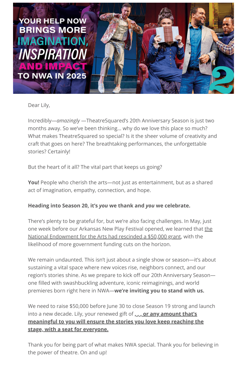 TheatreSquared's Development team conducts several major fundraising campaigns and donor appreciation/cultivation events per year.