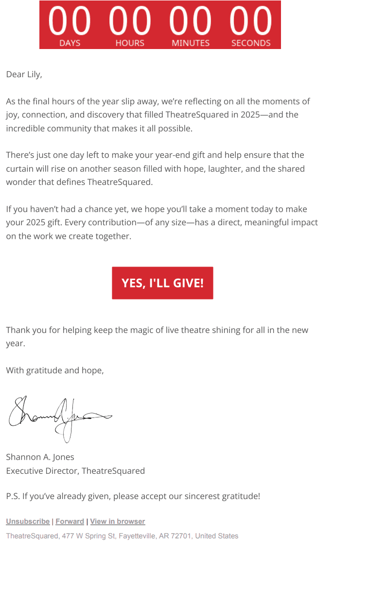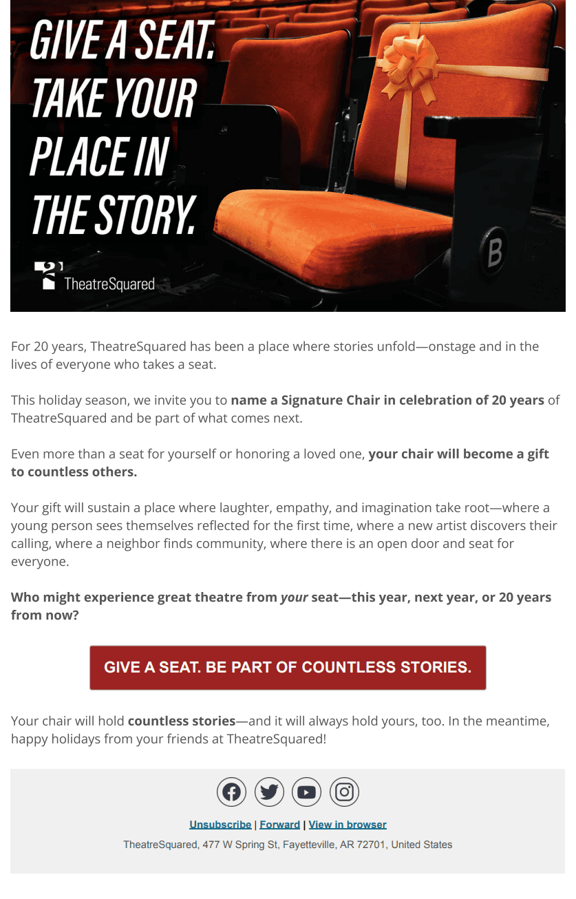 As the member of the Marketing team in charge of coordinating other departments' marketing needs, I handle high-volume email campaigns for these campaigns and events, often writing on behalf of our Artistic Director or Executive Director.