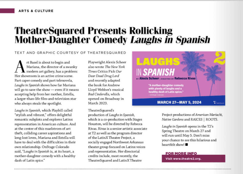 I maintain TheatreSquared's professional relationship with the editors and write a short promotional article for each show.