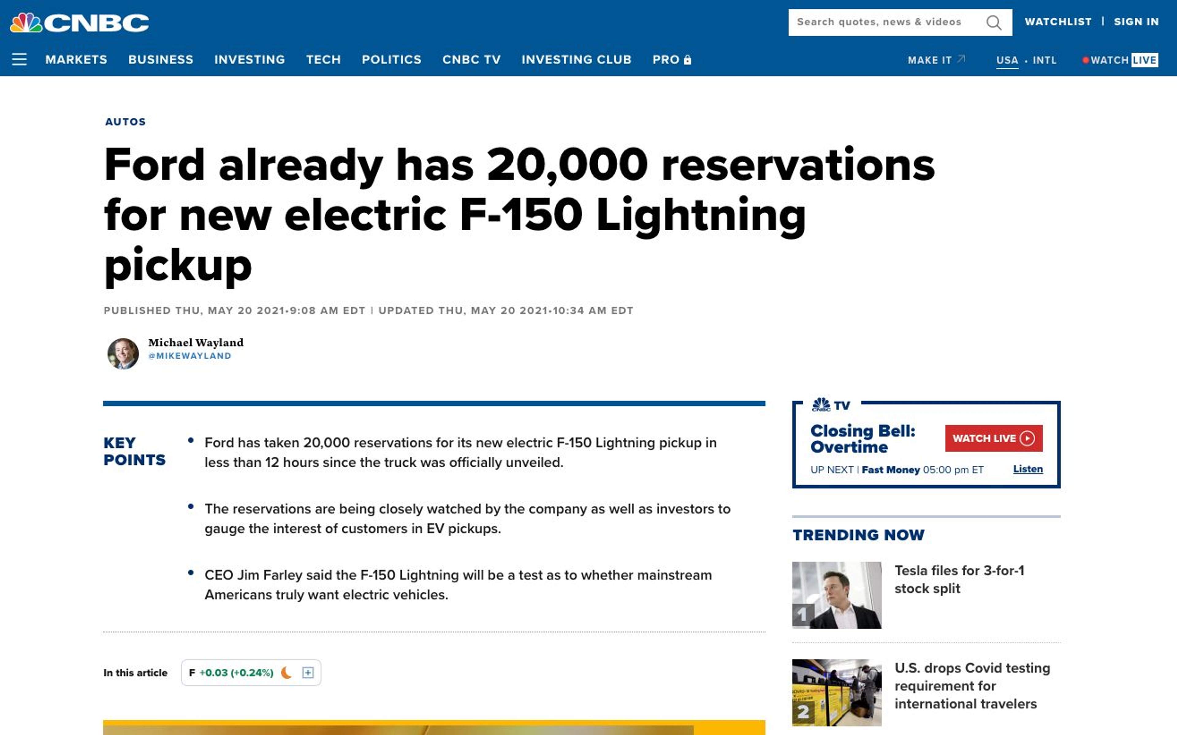 Ford took over 20,000 F-150 Lightning pre-orders in 12 hours.